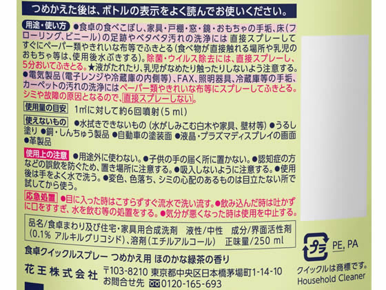 【検索用キーワード】花王 KAO 掃除用洗剤 リビング用洗剤 室内用洗剤 消臭 スプレー 食卓 詰替 詰替 花粉 多目的除菌 花王 KAO かおう カオウ 室内 詰替え 詰め替え つめかえ ツメカエ 1パック 1パック 拭き掃除用洗剤拭きそうじ用洗剤 キッチン 台所 家具 250ミリリットル 詰替用 詰め替え用 詰替え用 つめかえ用 ツメカエ用 つめかえよう ツメカエヨウ レフィル リフィル 除菌 緑茶の香り 掃除用品 花王 キッチン RPUP_02手軽にシュッ!ティッシュで菌・汚れもスッキリ!