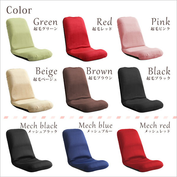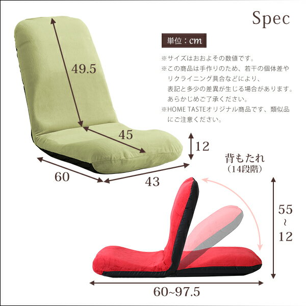 【商品について】美姿勢習慣、コンパクトなリクライニング座椅子(Lサイズ)日本製 | Leraar-リーラー-■サイズ:外寸:(約)幅43x奥行き60〜97.5x高さ12〜55cm(座面高:12cm)※商品重量:(約)4kg■カラー:起毛タイプ:グリーン、レッド、ピンク、ベージュ、ブラウンメッシュタイプ:ブラック、ブルー、レッド■素材:表地:ポリエステル構造部材:スチールパイプクッション材:ウレタンフォーム■その他:・完成品でのお届けです。