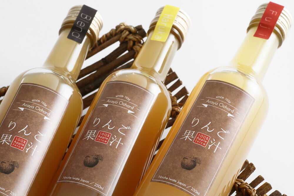 岩手生まれのプレミアムりんご「はるか」をはじめ、りんごの王様「ふじ」のほか、いくつかのりんごをミックスした「ブレンド」の3種類。