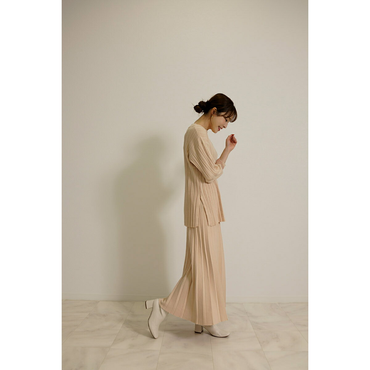 ニット製品にはプリーツ加工がかけられないため プリーツを再現するため、ランダムリブ編みで縦のラインを意識し ニットセットアップですが野暮ったさがなく、きれいめにタイトに見せます。