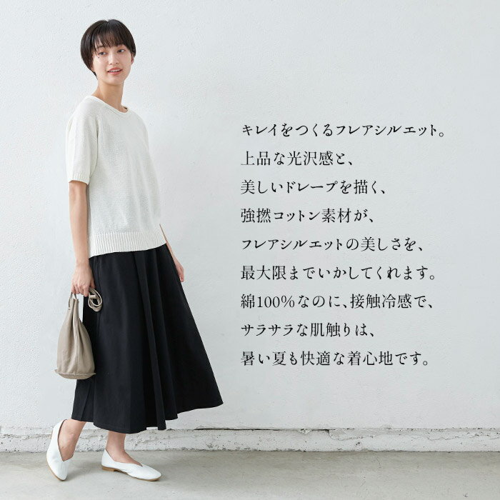 上品な光沢と、美しいドレープを描く、強撚コットン素材が、フレアシルエットの美しさを、最大限までいかしてくれています。