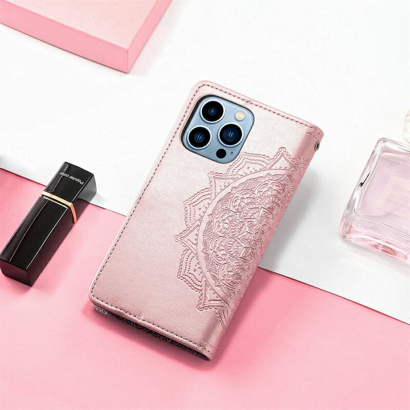 送料無料 iPhoneケース レディース用 スマホケース iPhoneカバー 女性用 折りたたみ式 収納ポケット カード入れ お札入れ マグネット マンダラ柄 レトロ調 可愛い おしゃれ