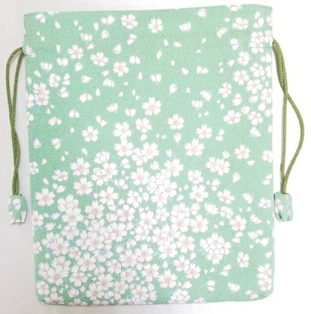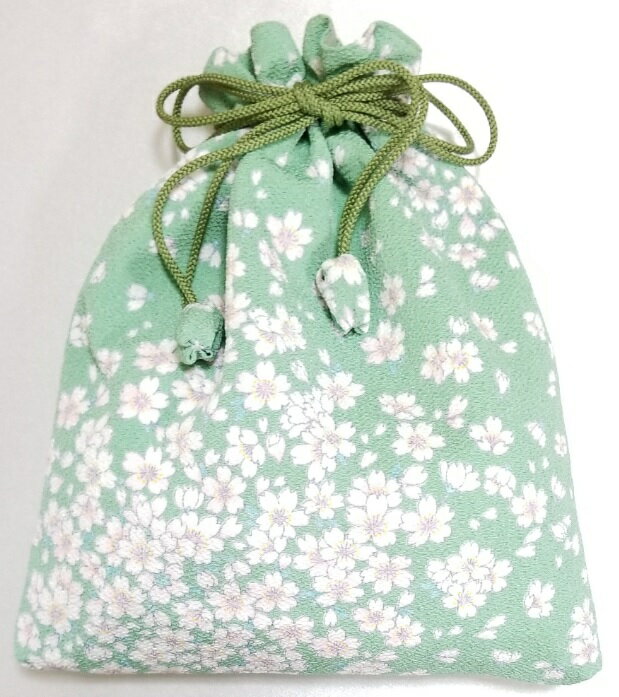 ちりめん平巾着(薄緑和桜)ちりめん 小物入れ 日本製 手作り 着物 浴衣 一点もの 御朱印帳入れ チューリップ型紐飾り モダン レトロ 大正ロマン【送料無料】