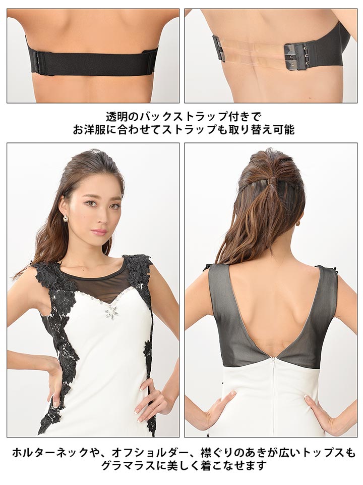 背中の空いた服も綺麗に着こなせる多機能ブラジャー!付け替え可能な同素材ストラップと透明ストラップの2本のバックストラップがセットになったお得な単品ブラ♪