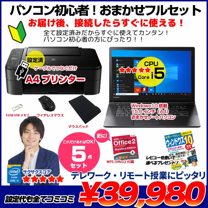 【中古】パソコン初心者応援 おまかせフルセット 中古ノート プリンター マウス マウスパッド 32GBUSBメモリ 初期設定済み Core i5 SSD128 4GB DVDマルチ