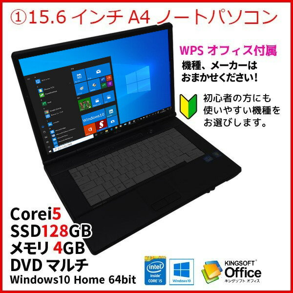 Windows7からの移行もスムーズに! ■中古パソコン 保証3ヵ月 セット内容 <本体> ・15.6インチA4ノートパソコン(メーカー・機種はお任せ) CPU:Core i5(第3世代以降) SSD:128GB メモリ:4GB ドライブ:DVDマルチ OS:Windows10 Pro 64bit 付属品:ACアダプター、Kingsoft WPS Officeライセンスカード <周辺機器> ・A4プリンター EPSONやCanonなど有名メーカーのお手頃A4プリンター ケーブルで接続すればすぐにお使いいただけるよう設定済みです。