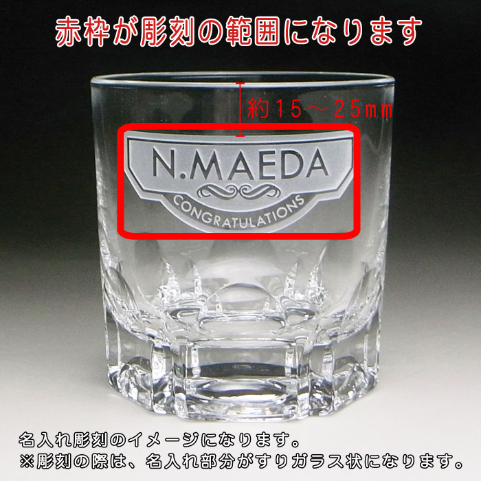 ~よくご利用いただくシーン~ 年中行事 成人祝い / バレンタインデー / ホワイトデー / 母の日 / 父の日 / お中元 / 敬老の日 / ハロウィン / クリスマス / お歳暮 誕生日祝い長寿祝い 誕生祝い / 長寿祝い / 還暦祝い(60歳) / 古希祝い(70歳) / 喜寿祝い(77歳) / 傘寿祝い(80歳) / 米寿祝い(88歳) / 卒寿祝い(90歳) / 白寿祝い(99歳) / 百寿祝い(100歳) 結婚祝い結婚記念日 プロポーズ / 婚約祝い / 両親へのご贈答 / 引き出物 / プチギフト / 席札 / 1周年:紙婚式 / 2周年:藁婚式、綿婚式 / 3周年:革婚式/ 4周年:絹婚式、皮婚式 / 5周年:木婚式 / 6周年:鉄婚式 / 7周年:銅婚式 / 8周年:青銅婚式、ゴム婚式 / 9周年:陶器婚式 / 10周年:アルミ婚式、錫婚式 / 11周年:鋼鉄婚式 / 12周年:亜麻婚式 / 13周年:レース婚式 / 14周年:象牙婚式 / 15周年:水晶婚式 / 20周年:磁器婚式、陶器婚式 / 25周年:銀婚式 / 30周年:真珠婚式 / 35周年:珊瑚婚式 / 40周年:ルビー婚式 / 45周年:サファイア婚式 / 50周年:金婚式 / 55周年:エメラルド婚式 / 60周年:ダイヤモンド婚式 / 70周年:プラチナ婚式 出産祝い子供のお祝い 出産祝い / 内祝い / 初節句 / 入園祝い / 入園記念 / 入学祝い / 入学記念 / 卒園祝い / 卒園記念 / 卒業祝い / 卒業記念 / 就職祝い / 進学祝い / 合格祝い / 先生へのプレゼント / 恩師へのプレゼント 仕事関係のお祝い 退職記念 / 退職祝い / 定年退職 / 定年祝い / 退職記念 / 就職祝い / 退官祝い / 勤続記念 / 栄転祝い / 昇進祝い / 開店祝い / 勤続記念 / 歓迎会 / 送迎会 / 送別会 / 上司へのプレゼント / 創立記念 / 設立記念 / 周年記念 / 記念品 / ノベルティ / ギフト / 粗品/イベント/ 卒団記念名入れ彫刻 カット調ウイスキーグラス(カット調ロックグラス) 重厚感あり綺麗なカット調のロックグラスに、装飾デザインと名入れ彫刻をすることで誕生日や還暦祝いのプレゼントにマイグラスを制作します。