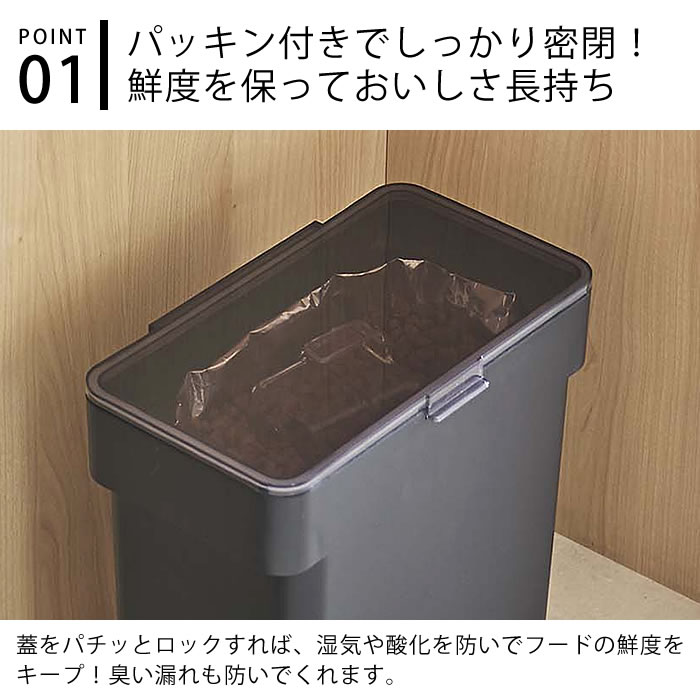 商品名 密閉袋ごとペットフードストッカー タワー 3kg 計量カップ付 関連商品 →ペットフードストッカー タワー 1.2kg →密閉ペットフードストッカー タワー 1.5kg 計量カップ付 →密閉ペットフードストッカー タワー 3.5kg 計量カップ付 →密閉袋ごとペットフードストッカー タワー 3kg 計量カップ付 →密閉ペットフードストッカー タワー 6.5kg 計量カップ付 →密閉ペットフードストッカー タワー 12kg 計量カップ付 商品詳細 サイズ 【本体】 外寸:約 W28×D16.5×H28.5cm(蓋開口時 H43cm) 底寸:約 W23.5×D13.5cm 開口部内寸:約 W24×D14cm 【計量カップ】 外寸:約 W7.8×D7.3×H7.4cm 重量 本体:約830g 計量カップ:約50g 容量 本体:約6L(ドライペットフード:約4kg) 計量カップ:180ml 素材 容器:ポリプロピレン 蓋:ABS樹脂 パッキン:シリコーン 計量カップ:アクリル樹脂 耐熱温度 本体:90℃ 計量カップ:100℃ 耐冷温度 -40℃ 仕様 ドライペットフード約4kg収納可、3kg用袋ごと収納可、計量カップ(付属品) 検索キーワード 密閉 袋ごと ペットフードストッカー タワー 3kg 計量カップ付 tower 密閉容器 保存容器 フードストッカー ペットフード 保存 湿気防止 餌収納 おしゃれ シンプル 餌入れ ドライフード エサ入れ 犬 ネコ ペット用品 5613 5614 タワーシリーズ 白 黒 ホワイト ブラック 山崎実業 yamazaki ヤマジツ ラッピング ラッピングOK →詳細はこちら密閉袋ごとペットフードストッカー タワー 3kg 計量カップ付 しっかり密閉しておいしさ長持ち3kg用を袋ごと保存可能なペットフードストッカー パッキン付きの蓋でしっかり密閉して、湿気・酸化・臭い漏れを防いでくれるペットフードストッカー。