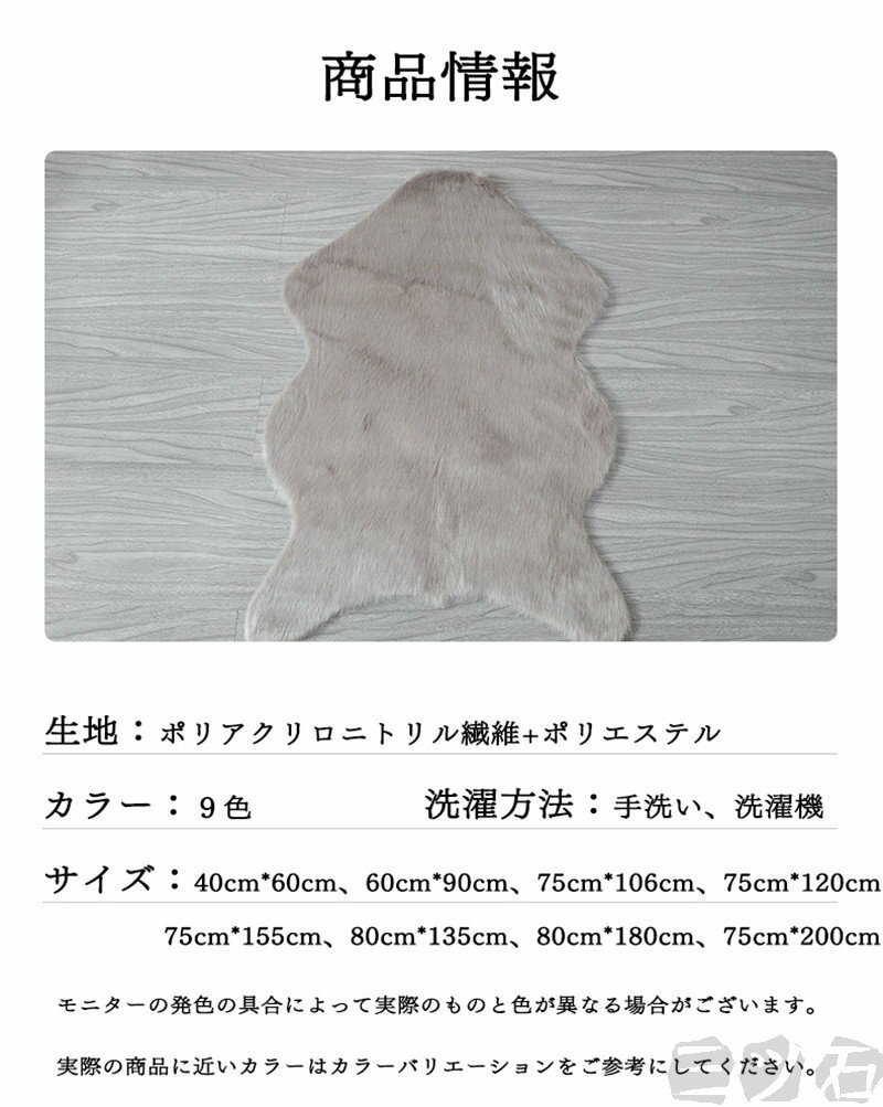 ぜひお気に入りのラグをみつけて、インテリアをワンランクアップしてくださいね! カラー:ホワイト、ブラック、グレー、ライトグレー、ゴールデン、グリーン、ローズレッド、パープル、ブラウン 素材:ポリアクリロニトリル繊維+ポリエステル サイズ:40cm*60cm値段:2500 60cm*90cm値段:3000 75cm*106cm値段:3500 75cm*120cm値段:4000 75cm*155cm値段:4800 80cm*135cm値段:5500 80cm*180cm値段:6000 75cm*200cm値段:6500 注意:サイズにより価格が違います。