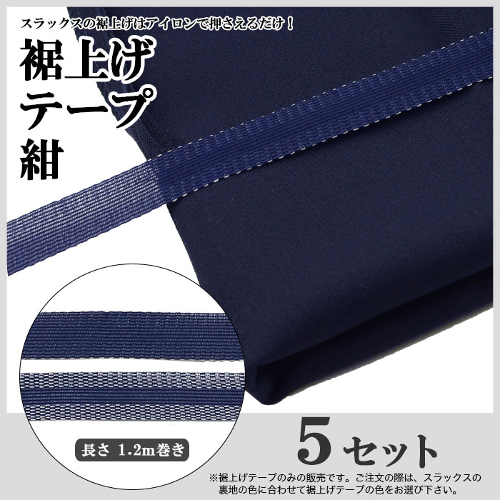 熱着裾上げテープ スラックスの裾上げはアイロンで押さえるだけ裾上げテープ 紺が5セット入ったお得セット 股下の長さが、不安な方、分からない方! 裾上げテープでご自身で簡単に裾上げできます! スラックス等の裾上げ作業から手縫いをなくしました。
