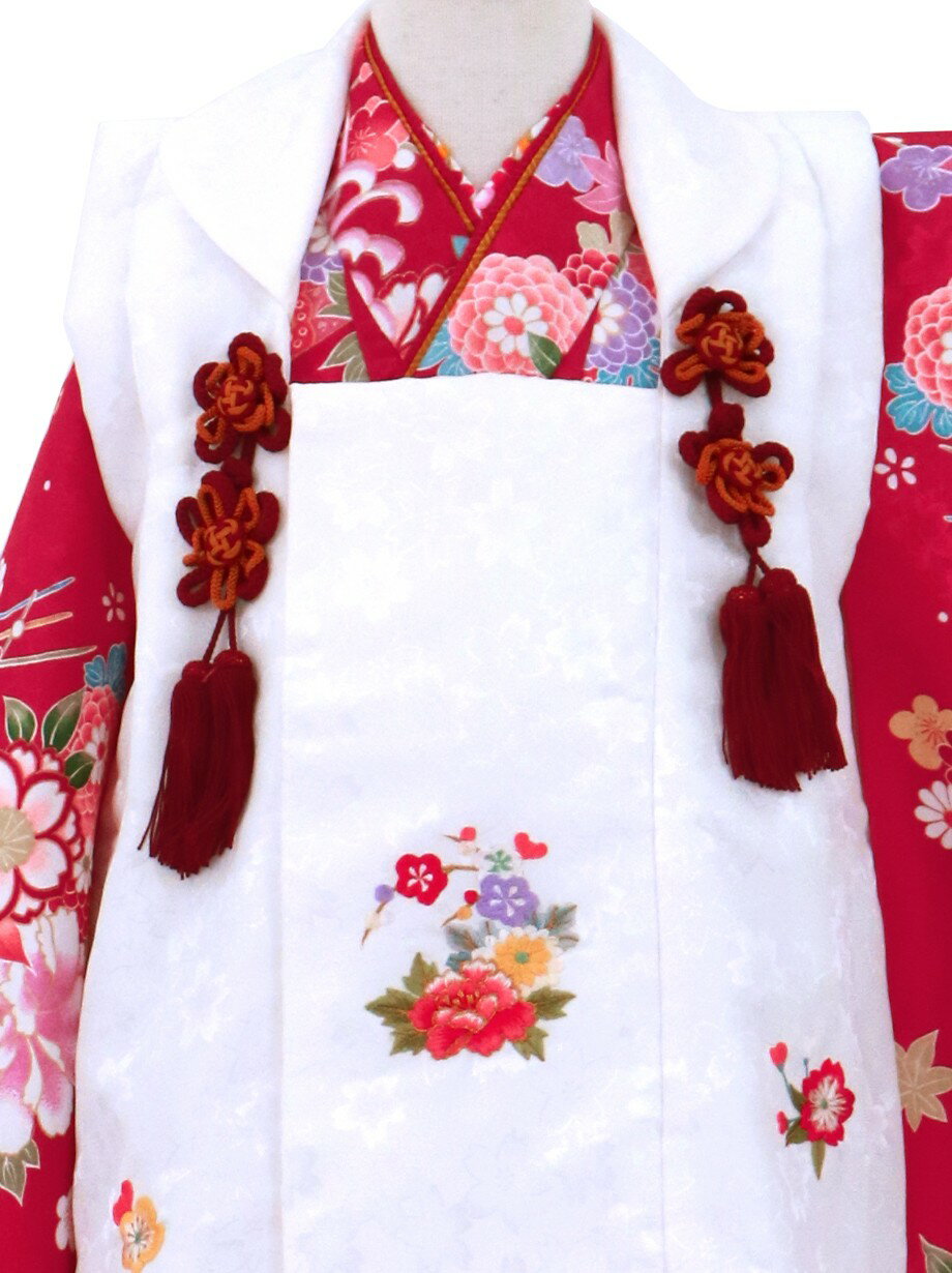 【レンタル】七五三 着物 3歳 フルセットレンタル 女の子 往復 送料無料 安心パック無料 赤 被布 フルセット 七五三レンタル 被布セット 753 三歳 3才 子供 セット 七五三参り 撮影 前撮り 結婚式 初詣 「赤地に牡丹と菊の被布コートセット」