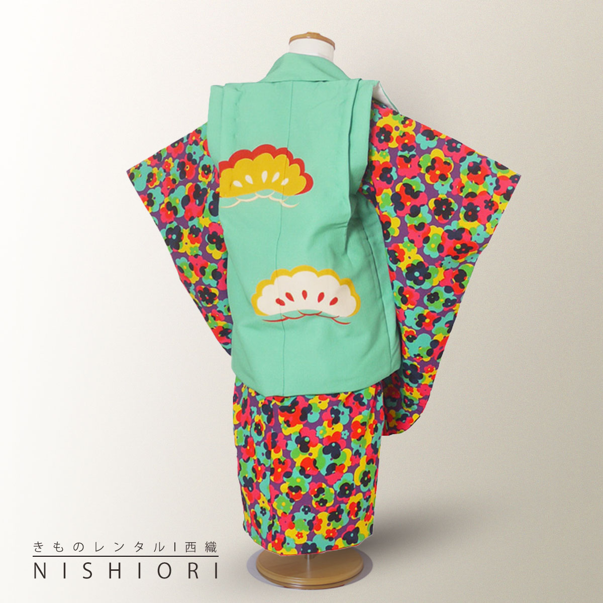 七五三 レンタル 女の子 3歳 着物 被布 753着物 フルセット 着物レンタル 貸衣装 七五三 三歳 子供着物 女児 子ども 可愛い ひな祭り 結婚式 和装新ブランド【LILLI】 緑 モザイク【往復送料無料】No.3030 新品足袋プレゼント